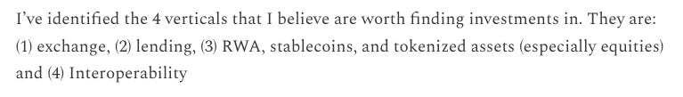 Evan makes the case that interoperability is one of four verticals worth focusing on as crypto integrates with TradFi. These comprise of picks and shovels that can earn fees regardless of whether the assets being traded are memecoins or tokenised equities.