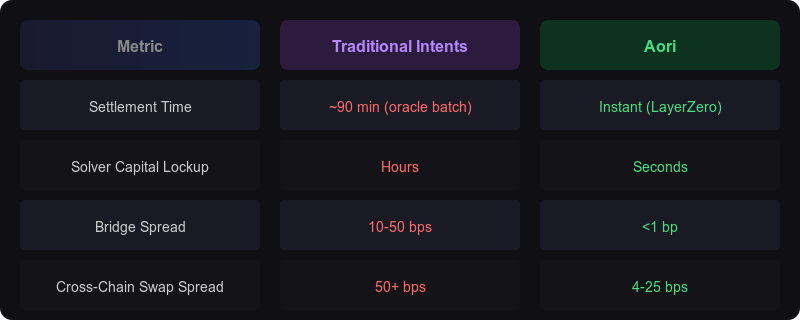 Aori takes an entirely different approach by using LayerZero for settlement instead of batched oracles.