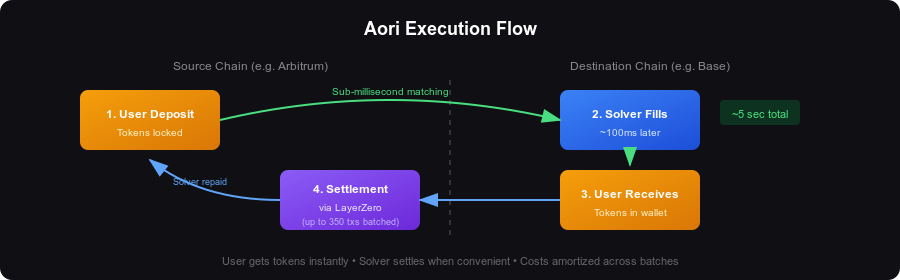 LayerZero settlement: Instead of waiting for an oracle to batch-verify, solvers settle via LayerZero messaging whenever they want