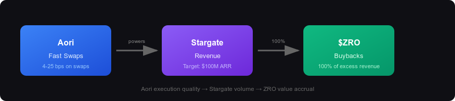 The cross-asset swap business is the higher-margin play, and that’s Aori. The better Aori executes → the more volume Stargate captures → the more buyback pressure on ZRO.