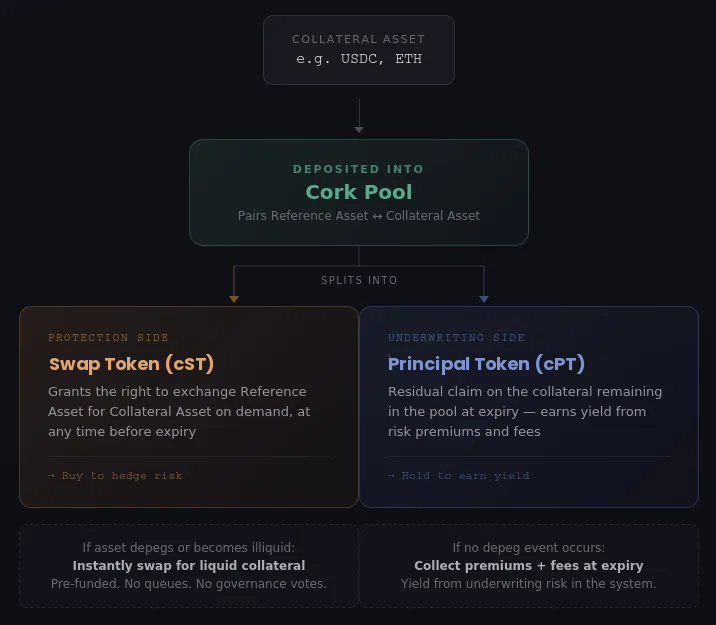 Cork is a programmable risk layer for onchain assets. The core primitive is the Swap Token; a tokenised derivative granting the holder the right to exchange a specified asset for a liquid collateral asset (like USDC) at pre-defined terms, at any time before expiry. Think of it as on-demand, pre-funded insurance for onchain assets.