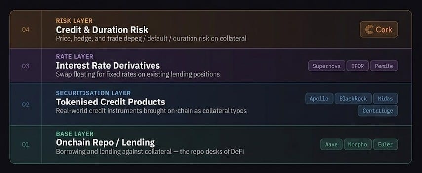 In traditional finance, these layers have existed for decades. What’s happening in DeFi is a re-derivation of the same financial stack with programmable, composable, transparent primitives rather than bilateral OTC agreements. With protocols like Supernova and Cork sitting on top of Morpho and other repo market infrastructure, you get something that starts to look like a functioning onchain credit derivatives market.