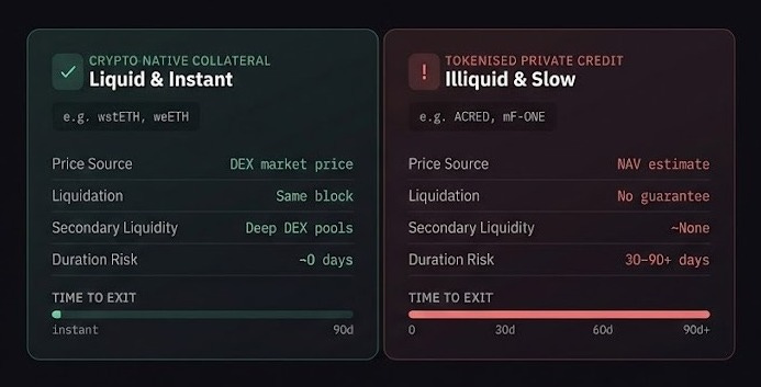 Increasingly we are seeing tokenised private credit (Apollo’s sACRED, Midas/Fasanara’s mF-ONE) start to be used as collateral in DeFi money markets. Steakhouse Financial recently published an excellent deep dive on this trend. The core challenge is that for crypto-native collateral like cbBTC, DeFi repo works beautifully because DEX liquidity makes the collateral instantly liquidatable. For tokenised private credit, these guarantees break down as there is often no secondary liquidity onchain. Redemptions can often take weeks or months. This creates a massive duration mismatch between the on-demand nature of DeFi lending and the illiquidity inherent in private credit.